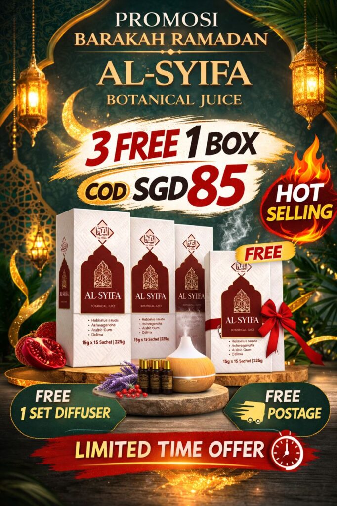 Setiap pembelian Jus Al-Syifa 3 botol Percuma 1 box extra dan 1 set diffuser pewangi rumah dan penghantaran secara percuma.